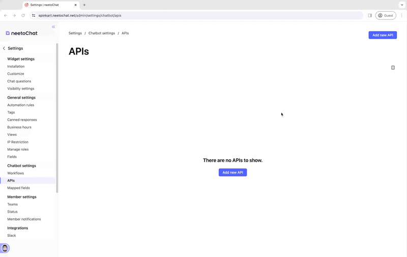 Navigate to Settings -> Chatbot settings -> APIs page.